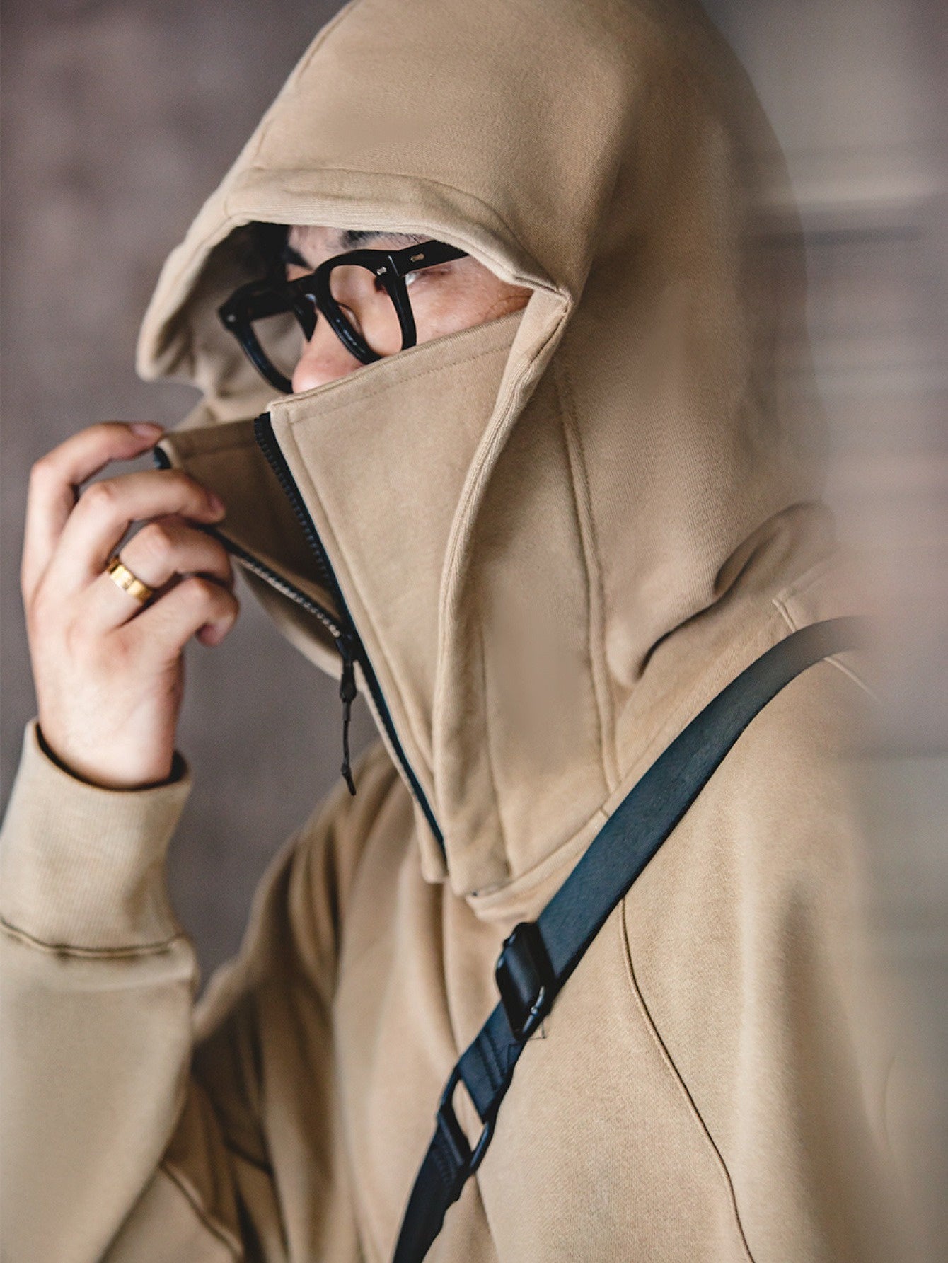 Adjustable Coverage: Features a unique high neck with a zipper that pulls up to cover the chin/lower face, plus an attached hood.
